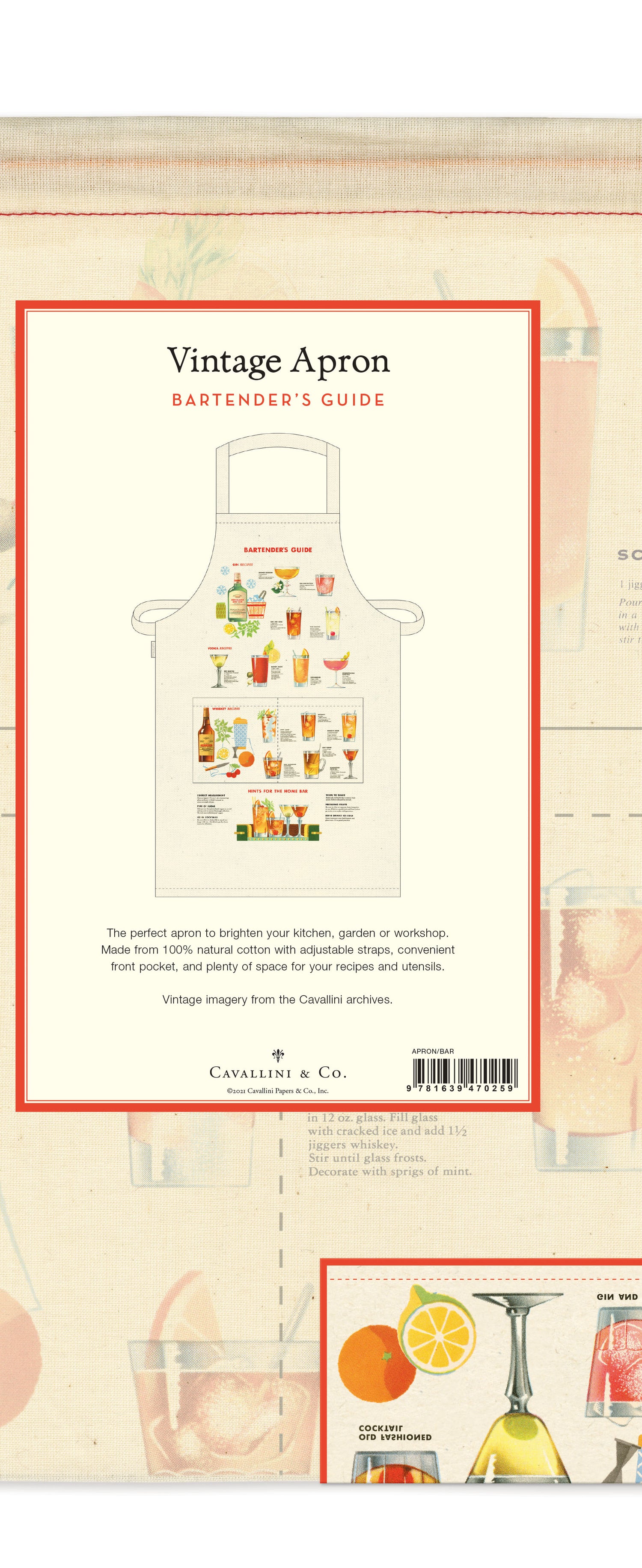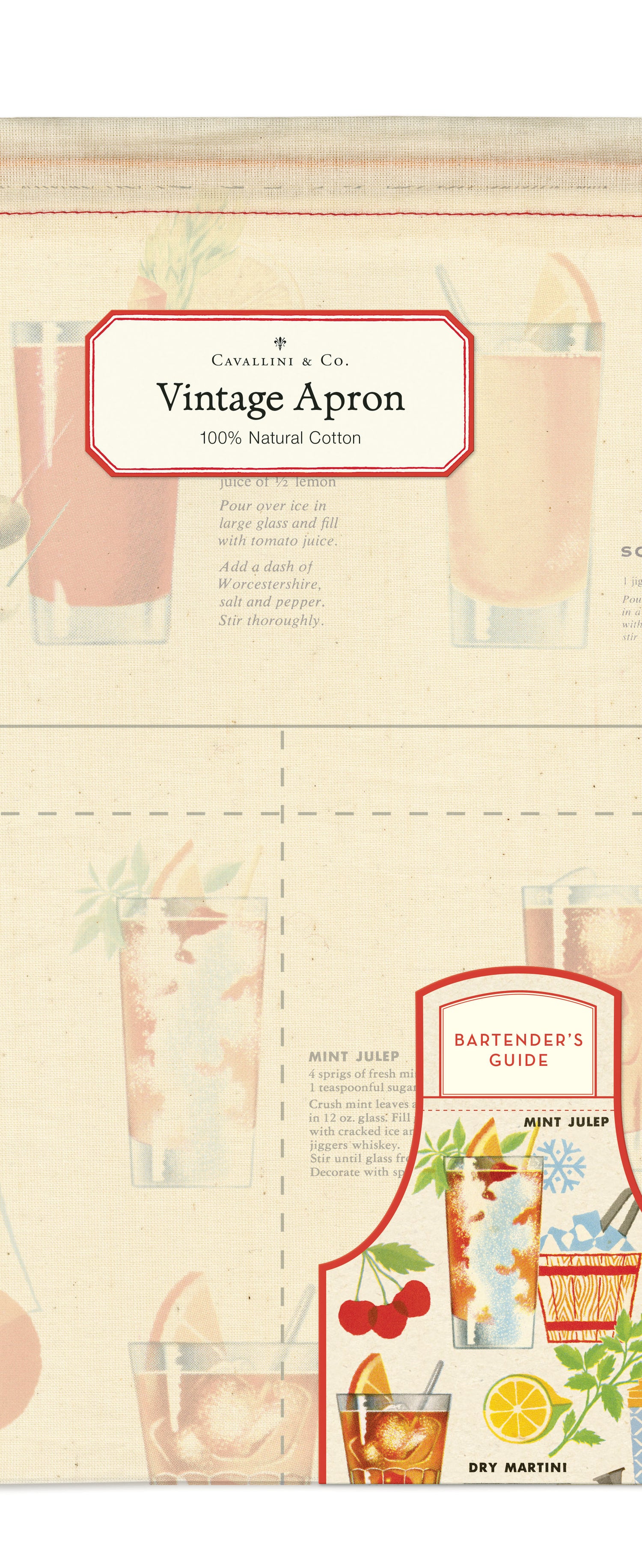 This vintage-style cotton kitchen apron features a charming Bartender's Guide classic cocktail design from the Cavallini archives.