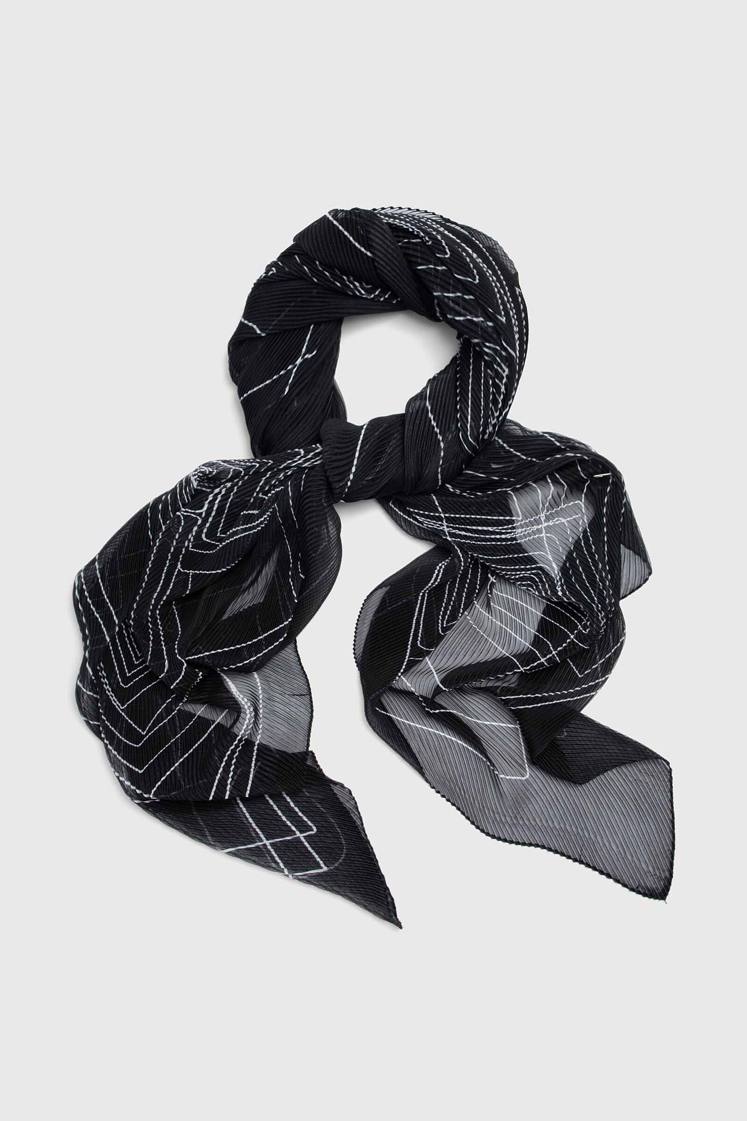 This chic Squares Geo Printed Pleated Scarf in Black & White is light and airy. It's the perfect accessory as it's versatile. It looks great on a tote or around the shoulders or neck.